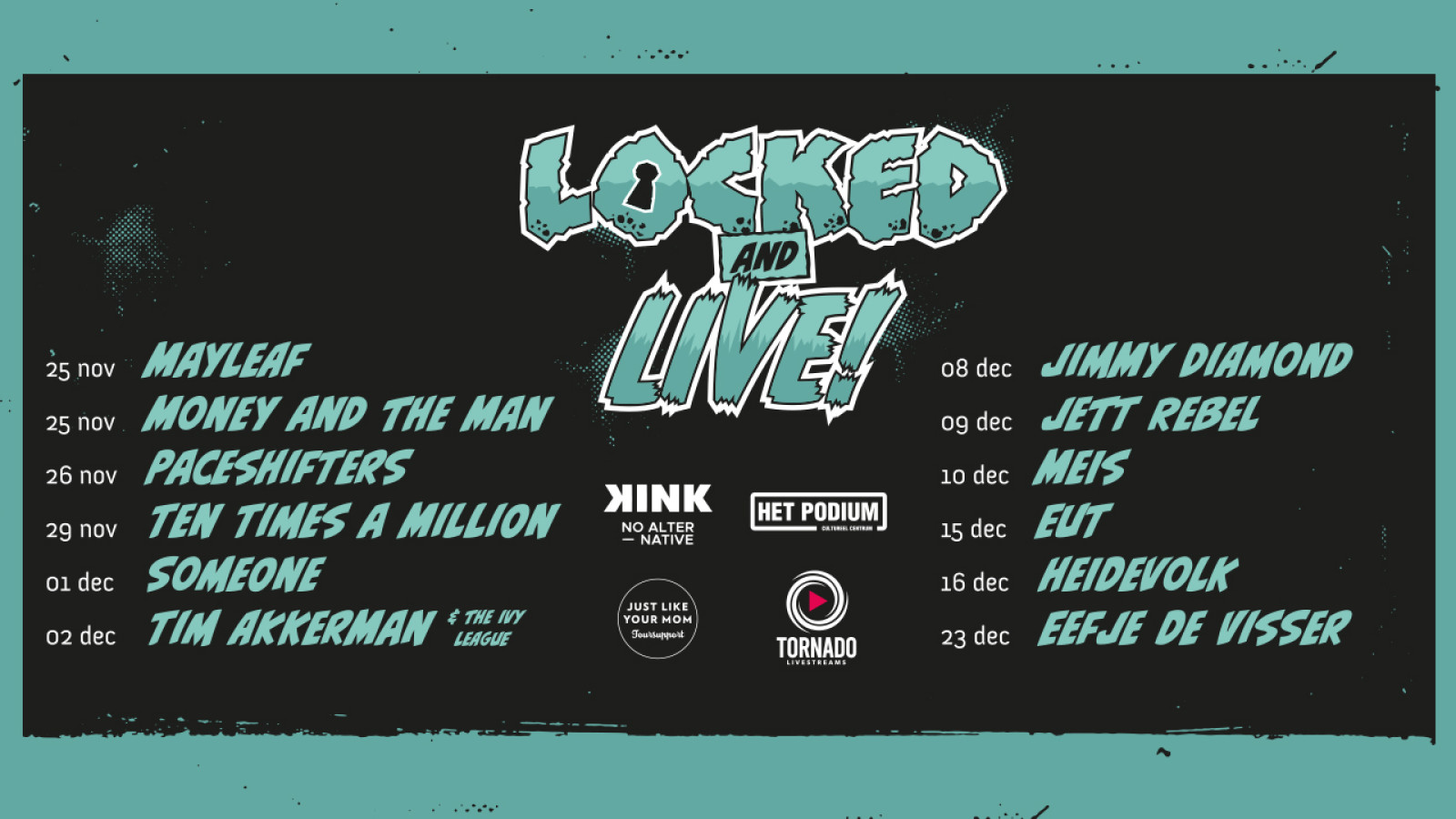 Locked & Live is een nieuw initiatief en start vanaf 25 november met livestreaming vanuit poppodium het Podium in Hoogeveen. Onder andere Eefje de Visser, EUT en Ten Times A Million geven een exclusieve show. Een appeltje voor de dorst nu live muziek in volle zweterige zalen niet meer gaat.